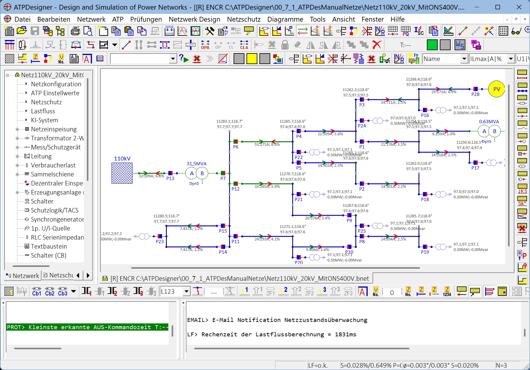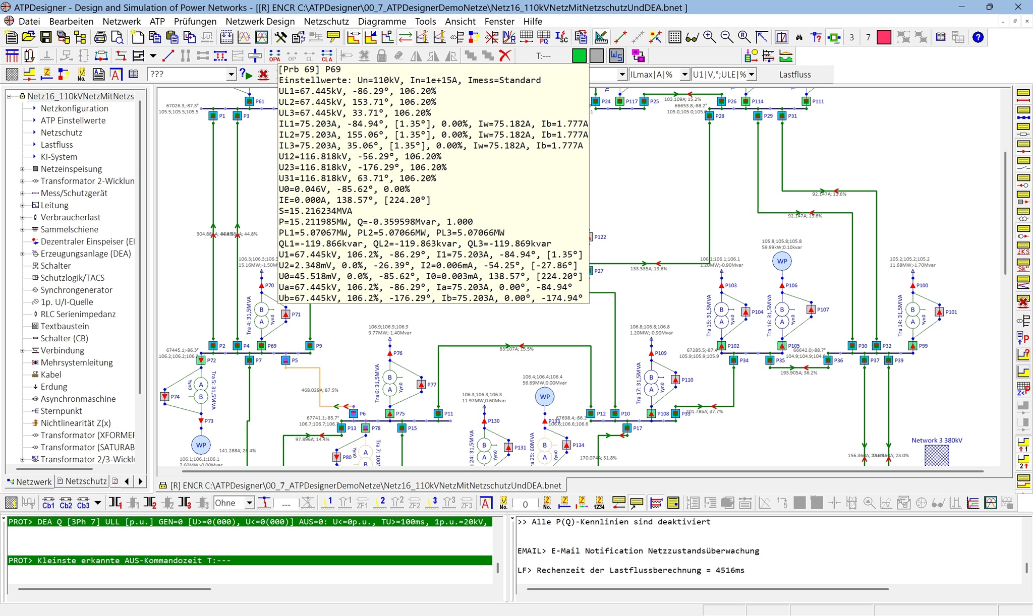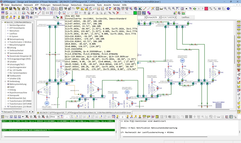 Das Netzberechnungsprogramm ATPDesigner zusammen mit dem Rechenlern ATP (Alternative Transients Program) ermöglicht die Berechnung stationärer Netzzustände auch mit dezentralen Ernergieerzeugungsanlagen wie Wind- oder Solarparks auf allen Spannungsebenen und Netzschutzsystemen, mit und ohne Kurzschluss. Die Ergebnisse der Lastflußberechnung werden in Tooltips und in einem Textfenster, direkt in der Netzgrafik oder in Berichten dargestellt.