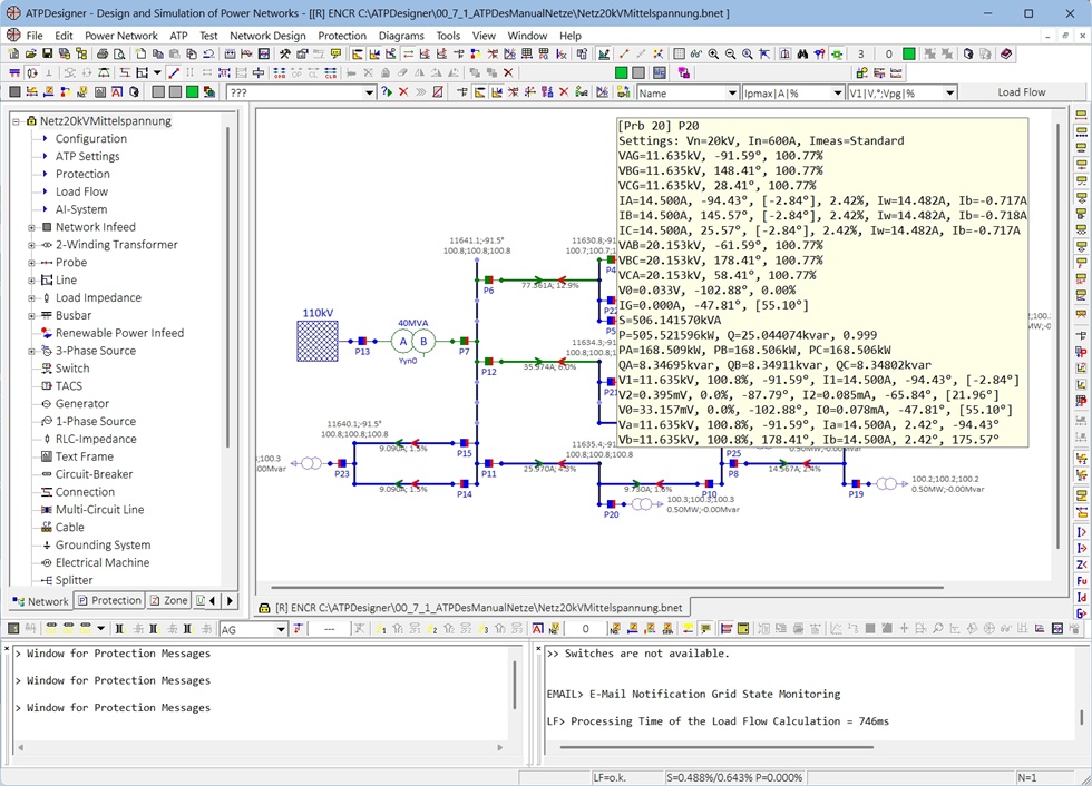 The network calculation program ATPDesigner, in conjunction with the ATP (Alternative Transients Program) solver, enables the calculation of steady-state network conditions, including those involving distributed energy generation facilities such as wind farms or solar parks, at all voltage levels and for all network protection systems, with or without short-circuit . The results of the load flow calculation are displayed in tooltips and in a Messages Window, directly in the Network View or in Reports.