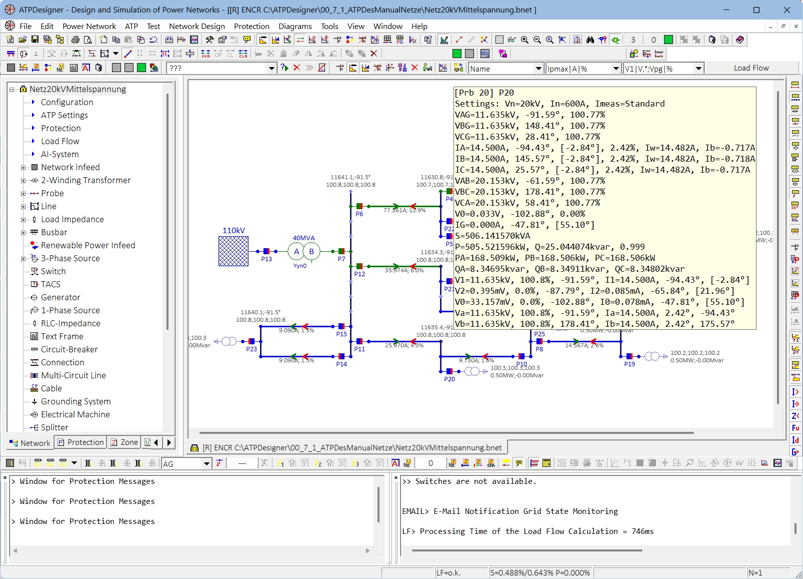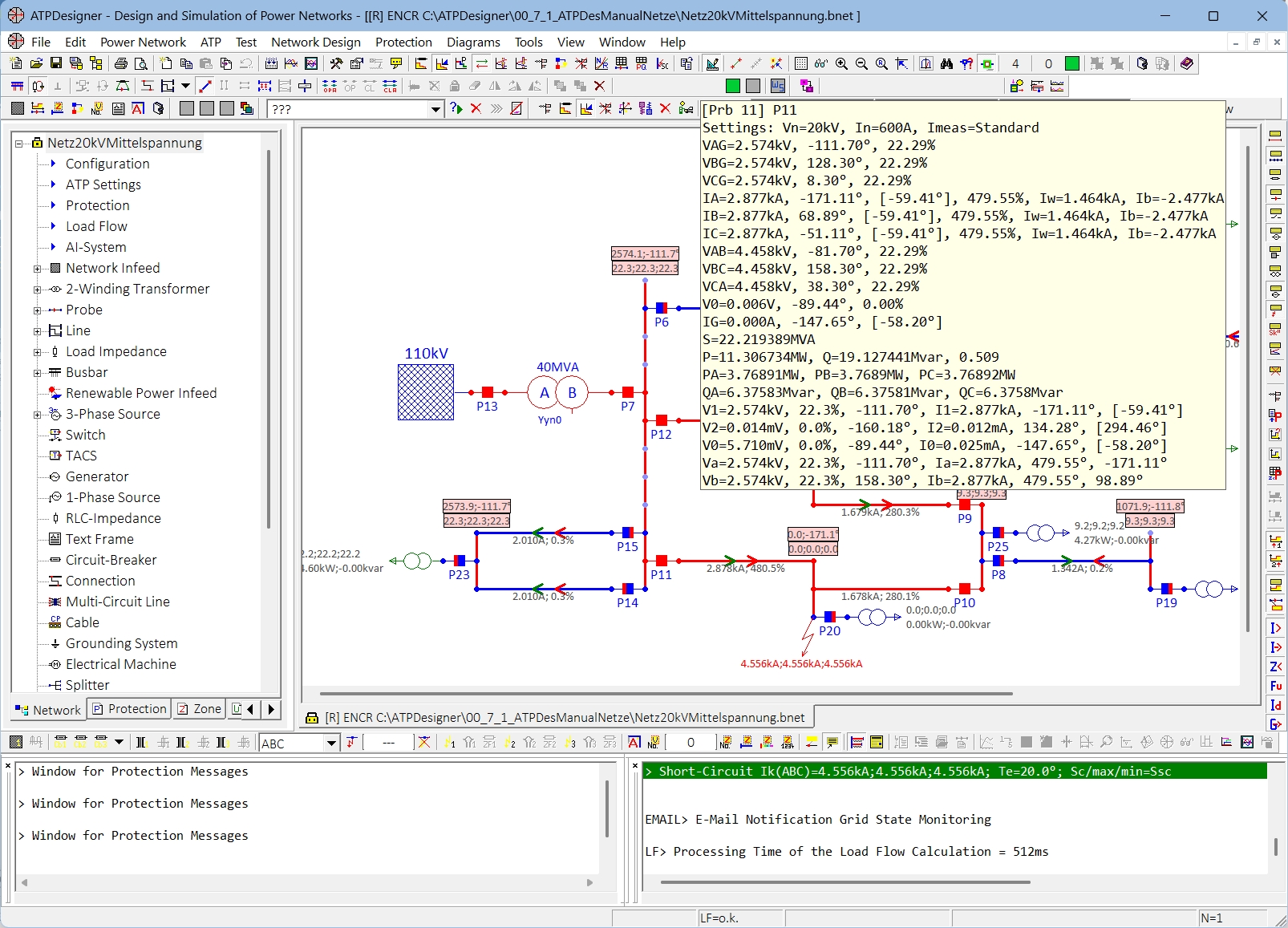 The network calculation program ATPDesigner, in conjunction with the ATP (Alternative Transients Program) solver, enables the calculation of steady-state network conditions, including those involving distributed energy generation facilities such as wind farms or solar parks, at all voltage levels and for all network protection systems, with or without short-circuit . The results of the load flow calculation are displayed in tooltips and in a Messages Window, directly in the Network View or in Reports.
