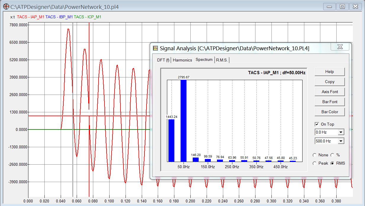 The figure below shows a short-circuit current. Using the both graphic cursors (red and grey line) ATPDesigner processes the Signal Analysis and displays the frequency spectrum or the R.M.S. value. The both graphic cursors can be moved e.g. using the cursor keys. ATPDesigner updates the frequency spectrum "on line" moving the graphic cursors by cursor keys.