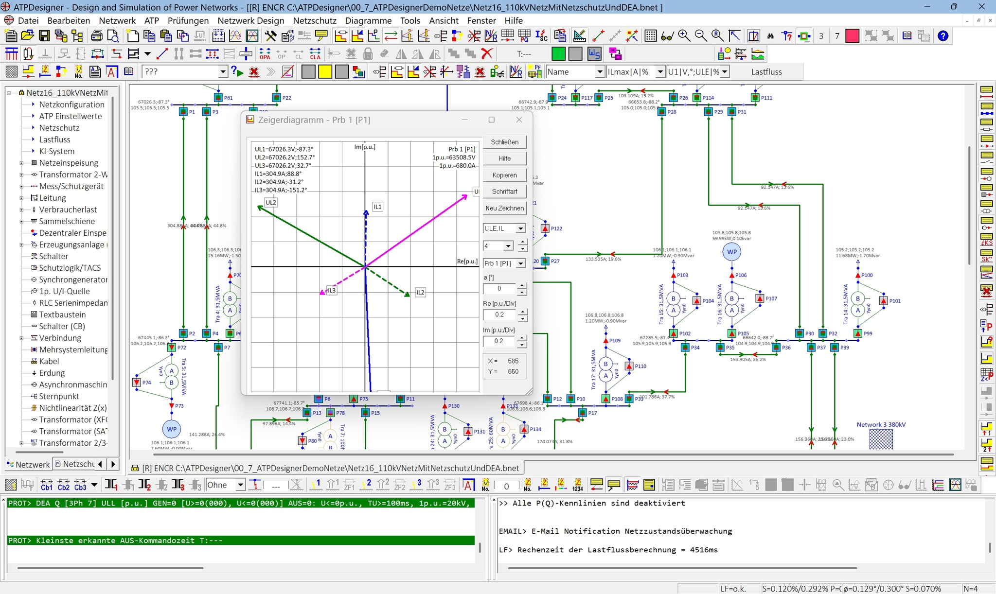 Die Abbildung zeigt ein 110-kV-Hochspannungsnetz im Netzberechnungsprogramm ATPDesigner mit Ergebnissen einer Lastflussberechnung in der Netzgrafik, d.h. den stationären Netzzustand. Zusätzlich können Spannungen und Leiterströme z.B. in einem Vektordiagramm dargestellt werden.